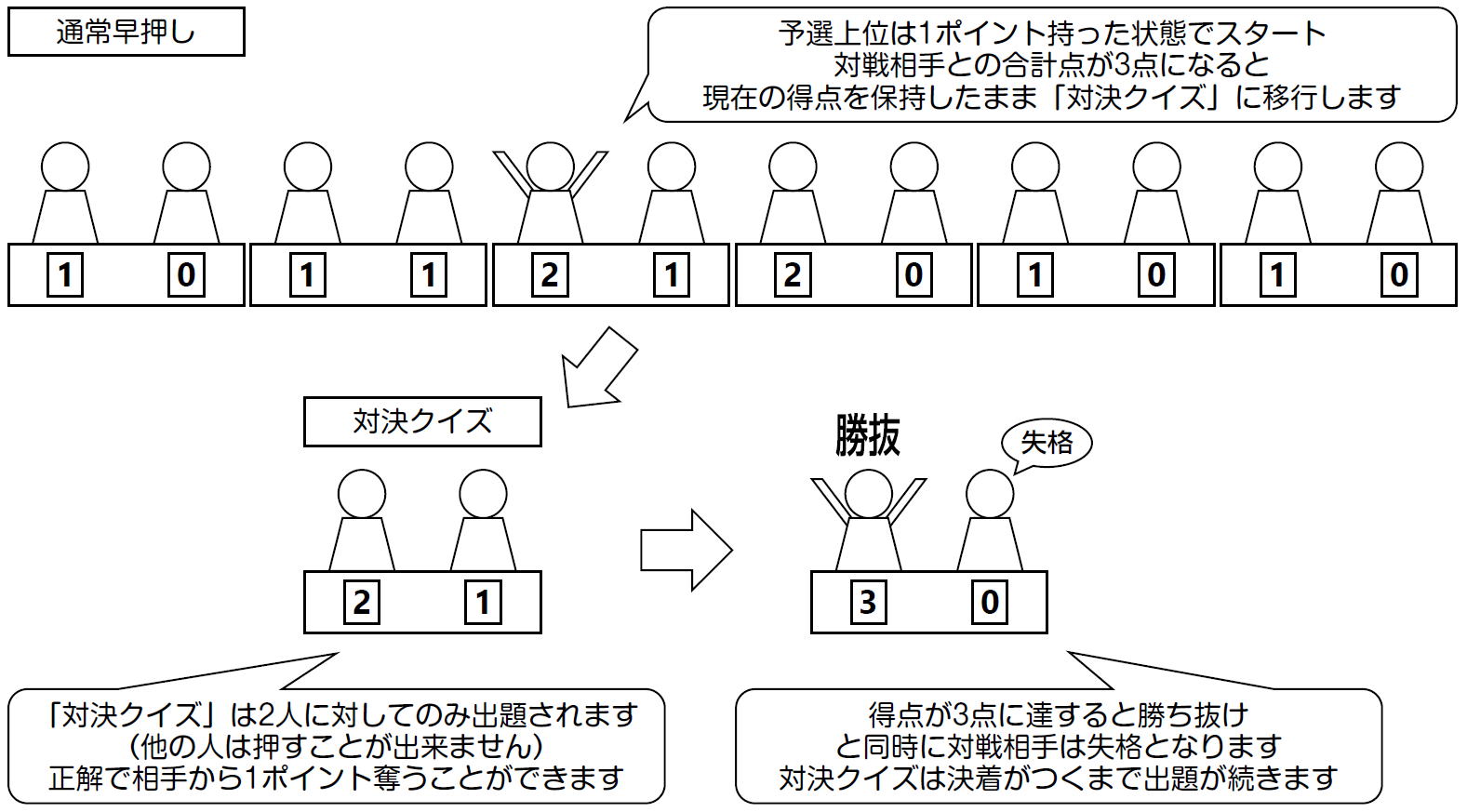 6.全体早押しで、対戦相手に1問も正解させることなく3ポイント積み上げた場合(3-0)は対決クイズへの移行無しに、即勝ち抜けとなります。